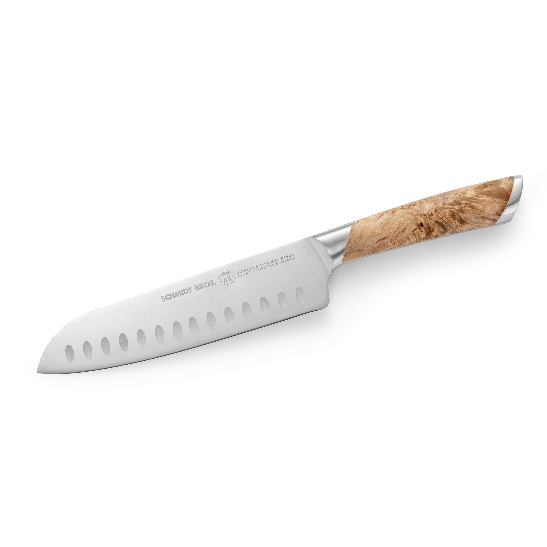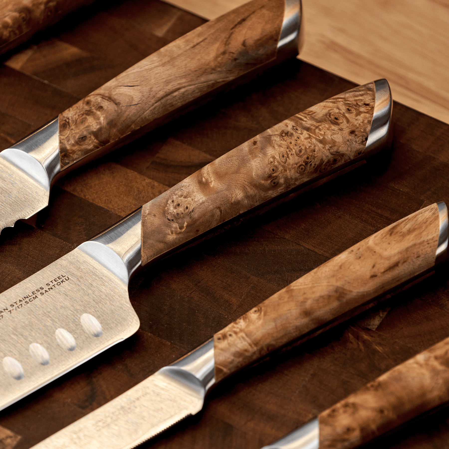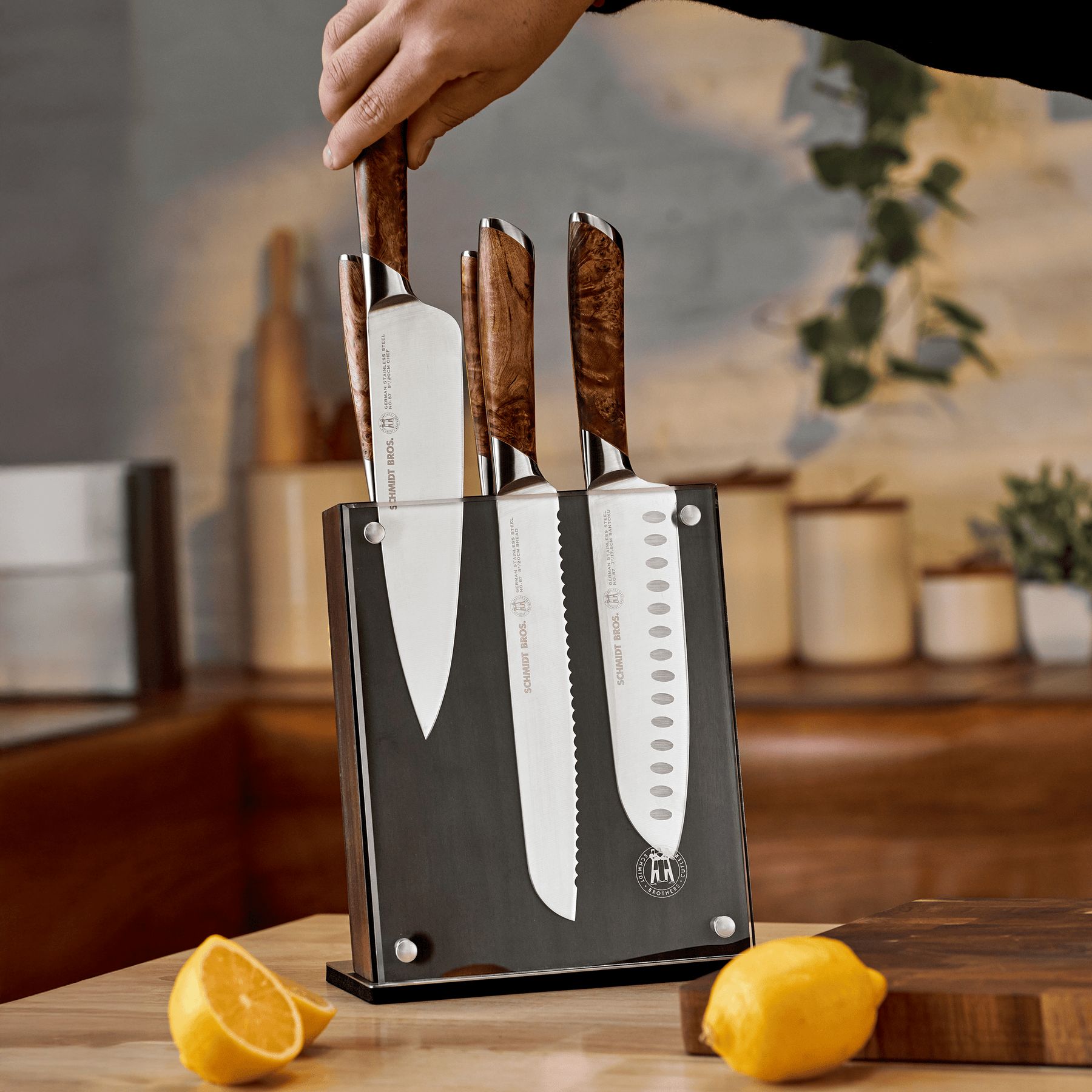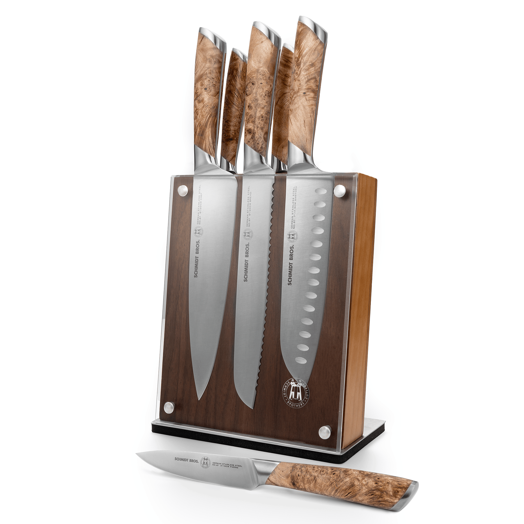 Inspired by the natural layers of stone, the Schmidt Brothers Strata 7-Piece Knife Set combines strength, precision, and timeless craftsmanship. Each knife is forged from layered high-carbon German stainless steel for exceptional sharpness, edge retention, and balance — the mark of professional-grade cutlery. Burl birchwood handles flow seamlessly into each blade, merging natural texture with modern design. Housed in a walnut knife block with magnetized acrylic panels, your knives stay beautifully displayed and easy to access. Designed for home chefs and design enthusiasts alike, the Strata Knife Set is the perfect blend of form, function, and fine craftsmanship.