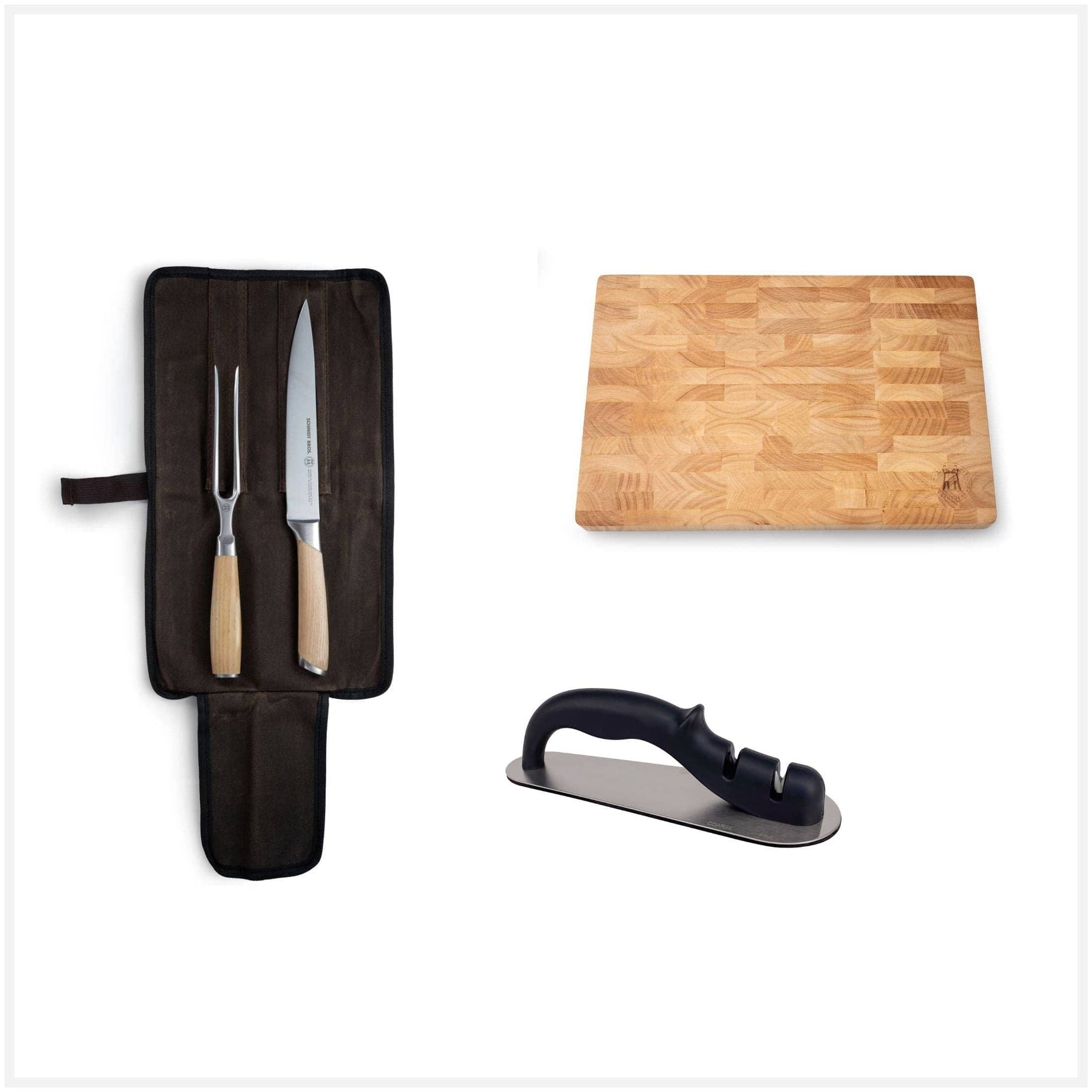 At its heart is the Summit Carving Set, featuring a precision slicer and carving fork with white oak handles that feel as elegant as they look. Each piece is crafted from high-carbon German stainless steel for long-lasting sharpness and balance, and comes nestled in a waxed canvas carrying case — ideal for chefs on the go or anyone who values craftsmanship and convenience.
