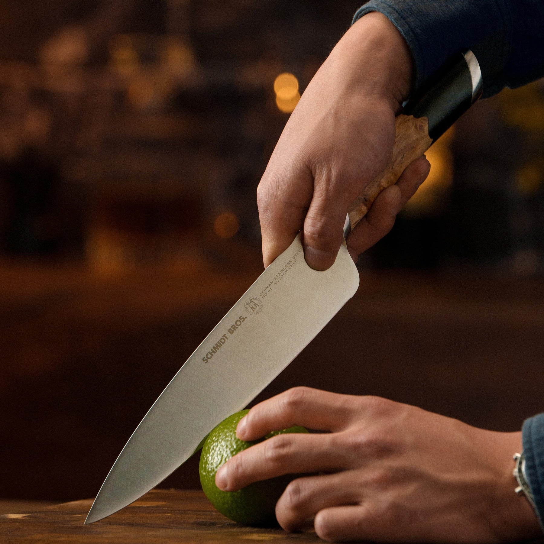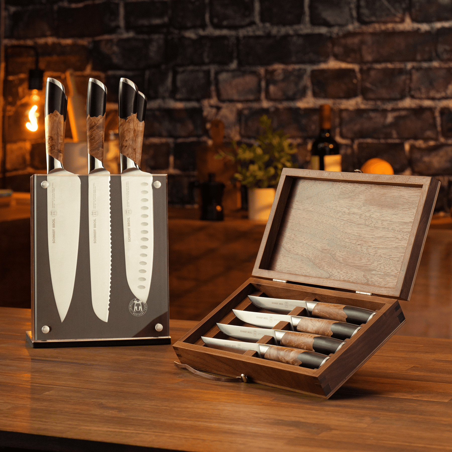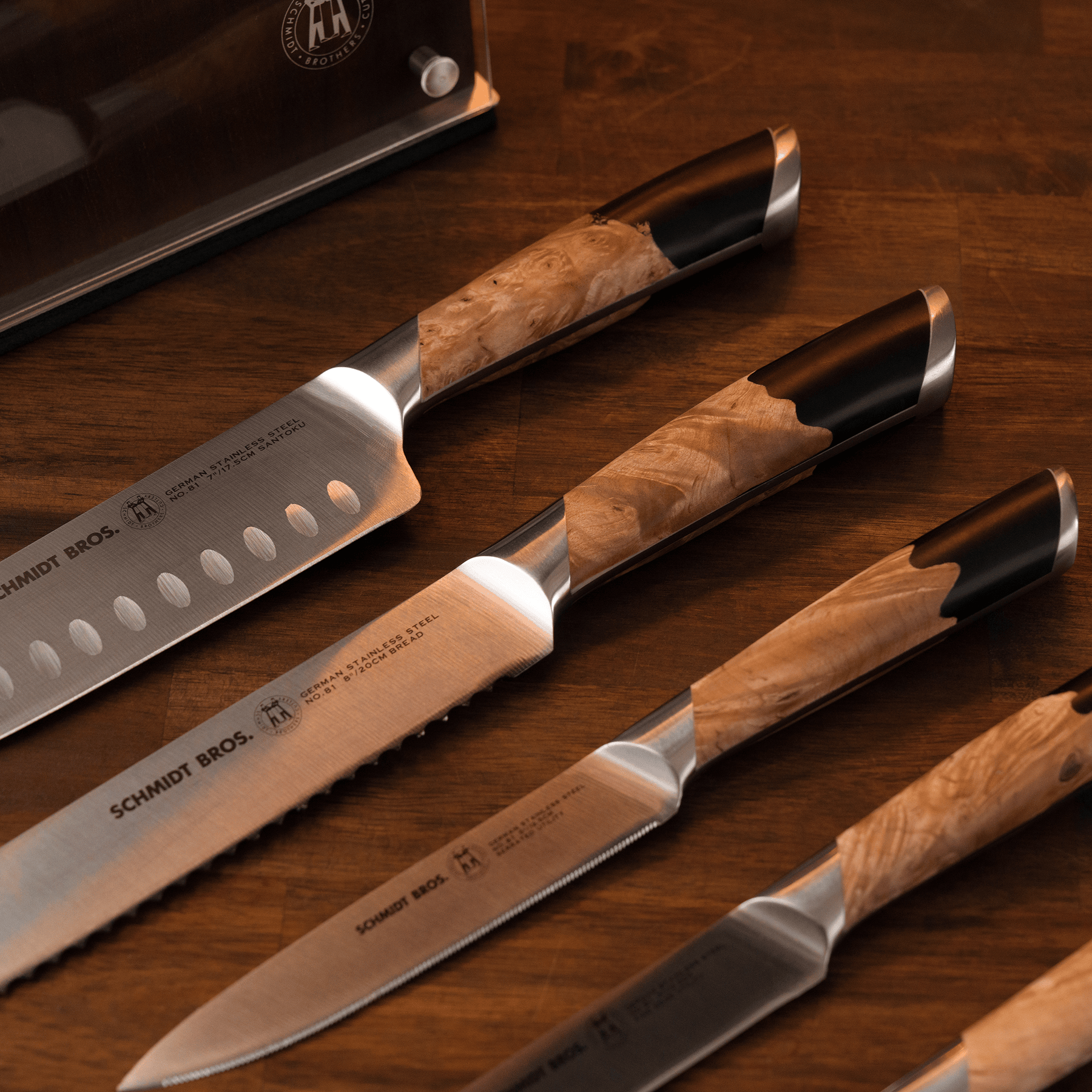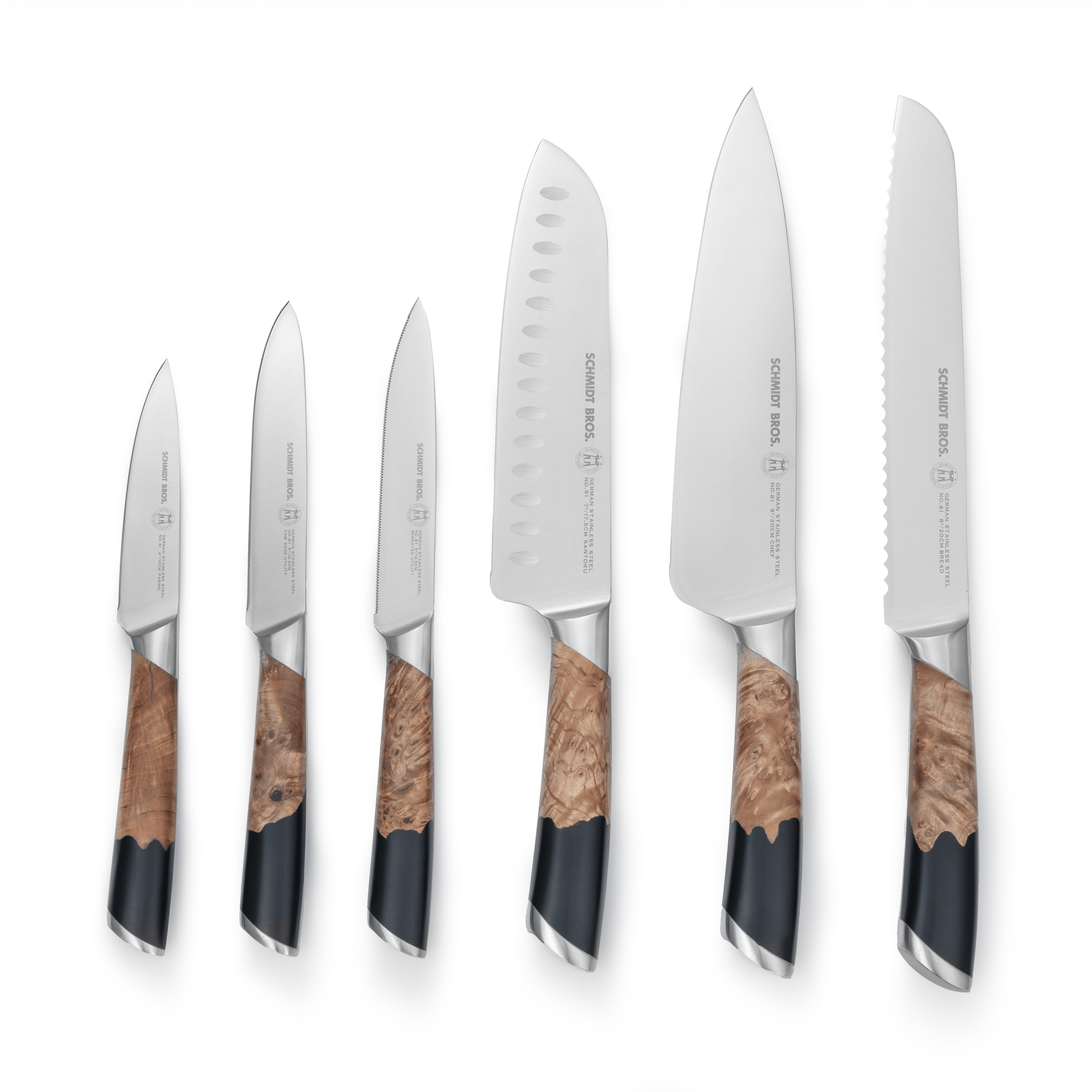 The Schmidt Brothers Fusion Knife Set fuses classic German craftsmanship with modern kitchen design. Forged from high-carbon German stainless steel, these knives deliver precision, strength, and effortless performance. Bold swirling wood and black resin handles make a striking statement, while the ergonomic design and custom knife block showcase your collection in style. Perfect for professional chefs and home cooks, Fusion blends performance with standout presence.