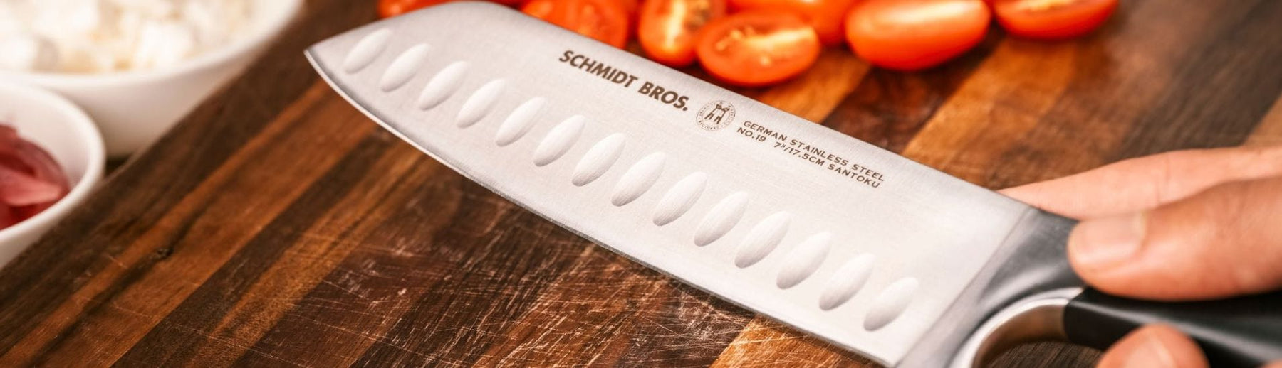 For the hardcore cutler-vore, we bring you the world-class 4-Piece Heritage Series Steak Set. It features the finest 100% German Stainless Steel blades housed in a wood storage gift box. Each blade is 5" and boasts the patented Schmidt Brothers Curve® - a space for your forefinger to rest and guide the knife more easily through that hunk of heaven.